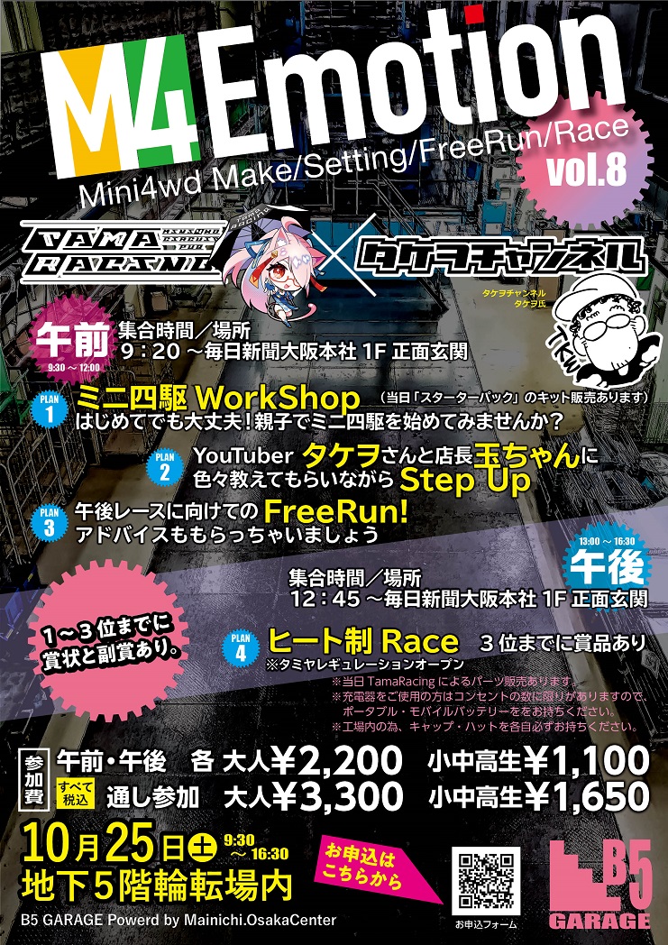 10月25日ミニ四駆イベントを実施いたします。 2部制となっております 午前の部は①②③のプランの方が同時に行います ①ミニ四駆を製作体験(キットは当日別売「スターターパック」をご用意させて頂きます) ②ミニ四駆をお持ちの方のカスタマイズとステップアップ。 ③午後の部の方の練習走行です。 午後の部はミニ四レーサーの方々に特設コースで④練習走行(30~40分)&レースを行います。 TamaRacingさんプロデュースによります爆速コースです。 MCは「タケヲチャンネル」でお馴染みの「タケヲ」さんです。 ※YouTube撮影(公開)が行われます。また、メディアの取材を受けることがあります。 ※これらの写真・動画に参加者の肖像等が映り込む可能性に同意した上でお申込みください。 申し込みは以下の申込みフォームから参加お申込みしてください。 |