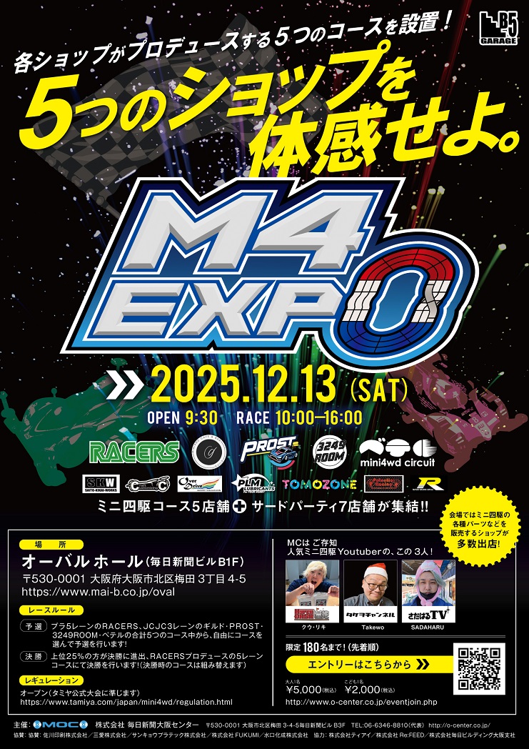 | 12月13日ミニ四駆イベントを実施いたします。 阪神地区の5つのショッププロデュースの5つのコースを設置 特色のある5つのショップを体感しよう ・レース実施(オープンタミヤレギュレーション) 予選は5ショップの3レーン&プラ5レーンコースで実施 決勝はプラ5レーンコースを組み替えて実施(予選通過25%) MCは『クウ・リキさん』『タケヲさん』『さだはるさん』をお迎えします。 7つのサードパーティによる展示販売も実施します。 ※YouTube撮影(公開)が行われる事があります。また、メディアの取材を受けることがあります。 ※これらの写真・動画に参加者の肖像等が映り込む可能性に同意した上でお申込みください。 申し込みは以下の申込みフォームから参加お申込みしてください。 |