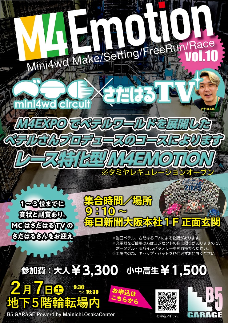 | 2月7日ミニ四駆イベントを実施いたします。 今回のM4EMOTIONはベテルさんプロデュースによります ロングコースでのレース特化型となります。 午前中からフリー走行、ヒート制レースを開始いたします。 MCは『さだはるTV』でお馴染みの『さだはる』さんです。 ※YouTube撮影(公開)が行われる事があります。また、メディアの取材を受けることがあります。 ※これらの写真・動画に参加者の肖像等が映り込む可能性に同意した上でお申込みください。 申し込みは以下の申込みフォームから参加お申込みしてください。 |