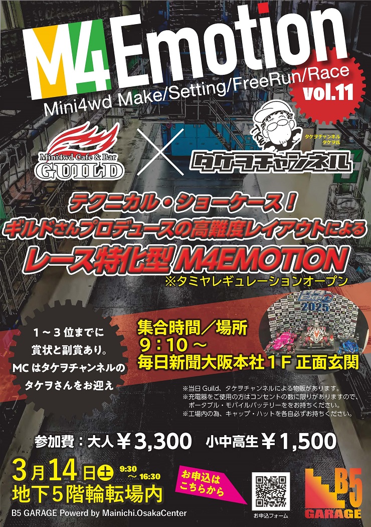 | 3月14日ミニ四駆イベントを実施いたします。 今回のM4EMOTIONはギルドさんプロデュースによります 高難度レイアウトによるレース特化型となります。 午前中からフリー走行、ヒート制レースを開始いたします。 MCは『タケヲチャンネル』でお馴染みの『タケヲ』さんです。 ※YouTube撮影(公開)が行われる事があります。また、メディアの取材を受けることがあります。 ※これらの写真・動画に参加者の肖像等が映り込む可能性に同意した上でお申込みください。 申し込みは以下の申込みフォームから参加お申込みしてください。 |